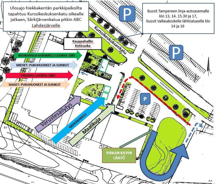 Bussikuljetus maalialueelta Tampereen linja-autoasemalle lähtee Kurssikeskuksenkadulta kurssikeskuksen portin pielestä klo 13, 14, 15.30 ja 17. Kuljetuksen voi ostaa ennakkoon (3 €) tai vasta bussista MobilePayllä (5 €). Kisatoimistosta voi ostaa myös lipun bussiin käteisellä tai pankkikortilla.
